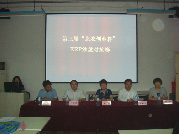 北农“创业杯”ERP沙盘对抗赛依托全国大学生创业设计暨沙盘模拟经营大赛和《企业经营决策沙盘模拟》课程建设,2007年,我校首次举办第一届北农“创业杯”ERP沙盘对抗赛,并选派代表参加“‘用友杯’第四届全国大学生创业设计暨沙盘模拟经营大赛”。2008年,举办第二届北农“创业杯”ERP沙盘对抗赛,并参加全国大赛北京地区预选赛,获得“优胜奖”。自2007年ERP沙盘对抗课程开设以来,得到校、院领导和职能部门的大力支持,先后为700多名同学开设本课程,200余名同学参加赛前培训与比赛。课程组教师积极进行课程建设。围绕该课程进行教改研究、网络课程建设,2009年,该课程被评为校级优秀课程,该课程的扩展课程有:公司理财与经营模拟、企业认知与经营模拟。