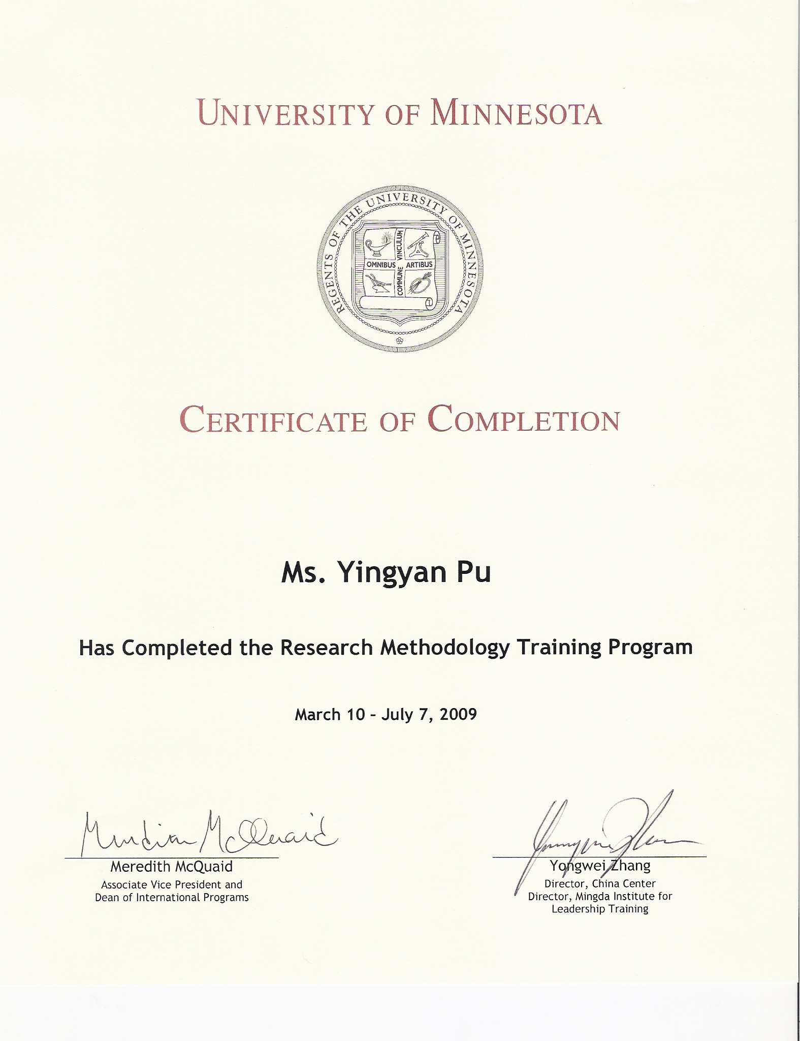 经管学院教师蒲应龑经过北京市教委的考核和选拔、在国内进行为期1个月的语言培训后,于2009年3月至7月在美国明尼苏达大学(简称“明大”)进行了为期4个月的访学。访学期间参加了明大的一系列学术活动、旁听了微观经济学、宏观经济学、国际金融、银行机构等课程、参与了导师进行的经济学实验等科研活动并与导师确定了合作方向,最后,经过考核,蒲老师获得了美国明尼苏达大学访问学者结业证书。