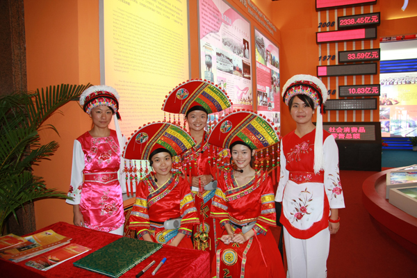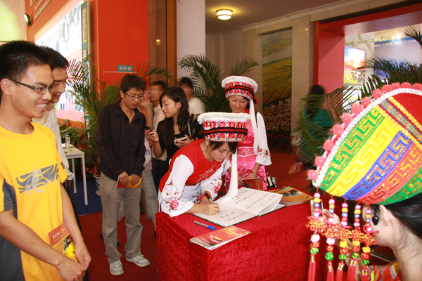 参观中,我院身着民族服装的两位白族同学李洁玉和李君成了一个亮点,所到之处参展观众纷纷与她们合影留念,争相了解白族民族习俗,对于大家的提问两位同学都一一解答,很好的展示和推广了民族文化。来自广西壮族自治区的同学在看了广西展厅后感慨万千,感受到家乡的繁荣昌盛与自身所肩负的重大使命。部分同学们在参观完后即兴在留言簿上留言祝福祖国60华诞,祝愿祖国繁荣昌盛,祝愿学校蒸蒸日上,祝愿经管学院明天更美好。