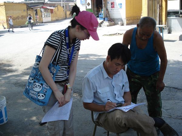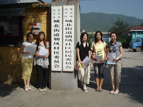 2009年8月23日上午,william威廉英国经管学院206413班农经特色小组一行5人来到昌平区朝凤庵村开展了关于农村人口文化程度和就业关系的一系列调查访问活动。烈日炎炎的处暑时节,组员丁吟、红乐、郑岩、苑雪、刘丽丽手拿问卷和自己准备的小礼物,带上热情的微笑走到村民面前。经过一个上午耐心询问,小组共获取数十位男女老少村民的相关真实信息,并通过个别访问,成功获得预期的调查效果,同时还收到了村民们的好评。在调查中,小组来拜访了村大队,同时了解到很多朝凤庵村的信息。朝凤社区位于昌平城区东北侧,十三陵水库路西侧,毗邻著名的十三陵水库风景区。区域面积3.5平方公里,现有耕地216亩,人口1218人,其中男性590人,女性628人。
