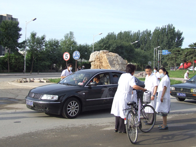白衣天使真诚服务,为新生及其家长进行体温测试,积极预防甲型流感,把好学生安全第一关。