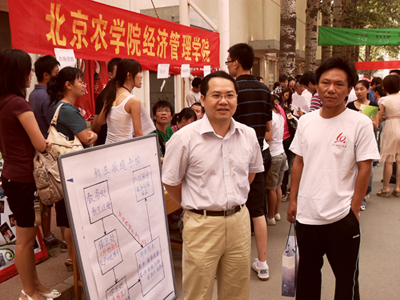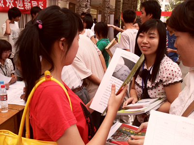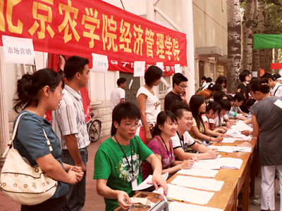 热情的的经管学生会成员和党员代表为新生办理入学手续。