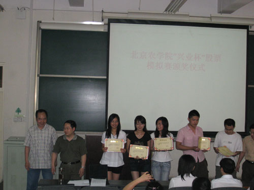 6月3日下午举办了颁奖仪式,经管学院院长何忠伟老师、总支书记李华老师、兴业证券公司副总经理周媛、李佰杰老师出席了颁奖仪式,并为获奖同学颁发了奖状和奖品。