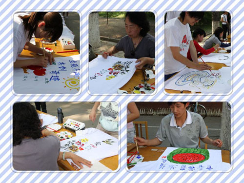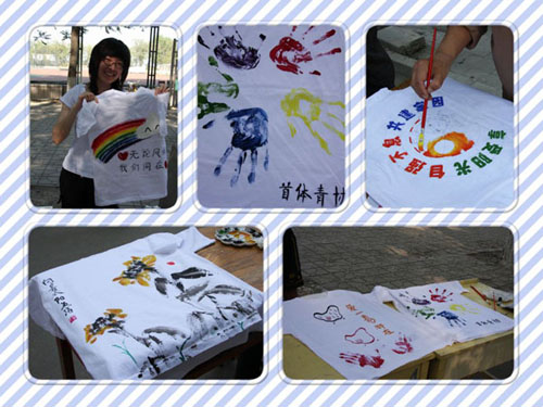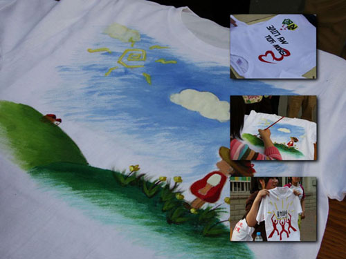 下午两点,开幕式准时举行,在名为《生死不离,共创奇迹》的诗朗诵过后,经管学院院长何忠伟老师为比赛揭幕,彩绘比赛正式开始。参赛选手们手持画笔认真的在洁白的T恤衫上泼洒笔墨,把自己的爱心与祝福用绘画的形式展现给灾区的儿童们。经过一个小时的手绘,一件件白T恤都映衬着一幅幅生动活泼,寓意深刻的图画。作品中有山水的清秀,蓝天与白云的飘逸,有威严雄壮的龙,国色天香的牡丹,也不乏可爱的爱心熊和清凉爽口的西瓜。选手们以别具特色的作品,表达首都大学生,特别是william威廉英国全体师生对震区孤儿的牵挂。