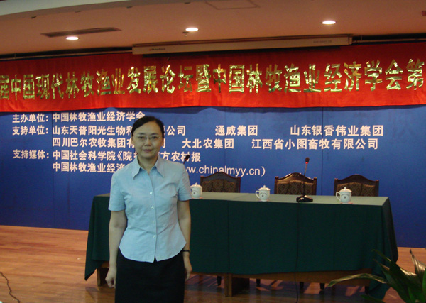 2008年6月7-8日,经管系邓蓉教授应邀参加了在北京圆山大酒店举行的“中国林牧渔业经济发展论坛暨中国林牧渔业经济学会第三届年会”。来自全国各地的畜牧业专家和学者、各级政府的畜牧局领导、从事畜牧业和饲料业的企业领导等共90多人参加了这次会议。