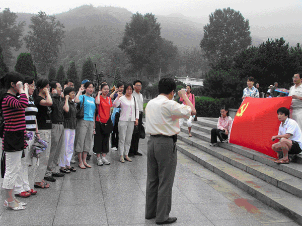 在雄伟的平北抗日战争烈士纪念碑前,经贸系的同志们向烈士们深深行三鞠躬礼,以表达对革命先烈的缅怀之情。面对纪念碑,总支书记李华领誓,大家庄严的举起右手,重温了入党的誓言。之后新党员代表张子睿同志谈了自己此次参观的感想,接着李华书记作了语重心长的总结发言,充满激情的话语表达出经贸系教师不忘历史、理想永存,永保党员先进性的决心。
