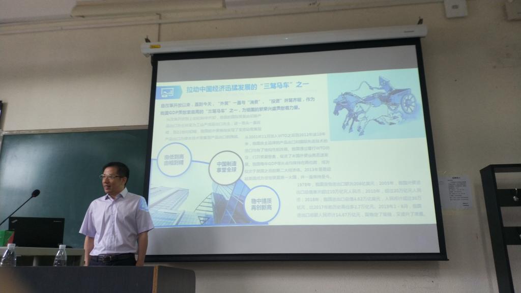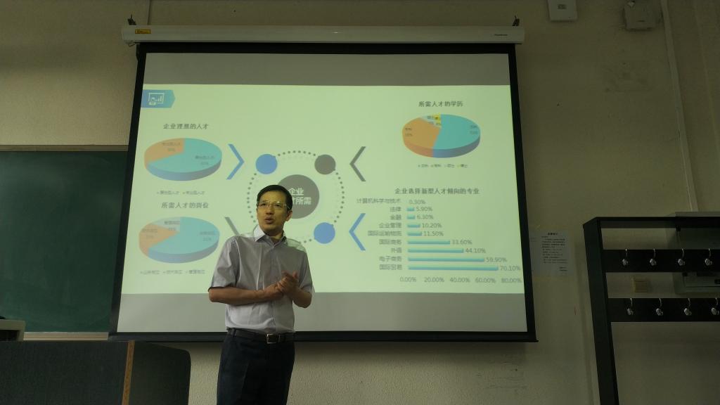 2019年9月5日,经济系邀请南北天地科技股份有限公司公司董事长彭易清来校,为2019级国际经济与贸易专业的新生做专业教育。彭总分析了我国对外贸易在经济发展中的地位和内外环境变化,以及外贸行业从传统业务向综合服务演进的新形势。站在外贸行业的角度,分析了在跨境电商快速发展和”互联网+外贸企业”的大背景下,企业对人才需求的新变化,毕业生的就业前景;并从专业技能、行业知识、外语能力等三个方面对学生的职业规划提出了中肯的建议。