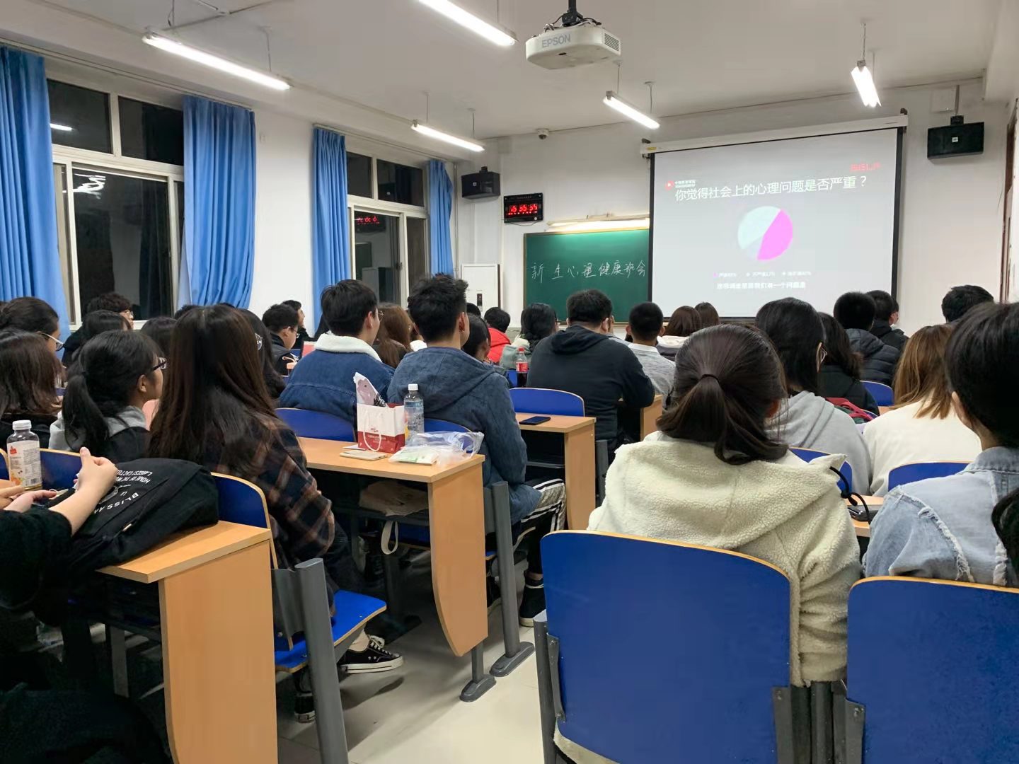班会以一段舒缓的轻音乐开始,带领同学们调整呼吸,放松身心。随后以心理情景剧和PPT介绍带大家进入主题班会,通过心理情景剧,学会了同学之间应友好相处、互相帮忙,如何缓解心理压力以及找教师或同学帮忙来消除、而不是做出其他损害他人利益的事来消除压力。随后的PPT中介绍了近年来学生因心理问题走上极端的人数扇形统计图,使同学们充分地认识到心理健康的重要性。第二个环节是观看心理健康知识讲座的微视频,提醒同学们要不断增强心理调适能力和社会生活的适应能力,处理好环境适应、自我管理、学习成才、人际交往、交友恋爱、求职择业、人格发展和情绪调节等方面的困惑。最后,同学们围绕心理困惑进行了探讨、交流。