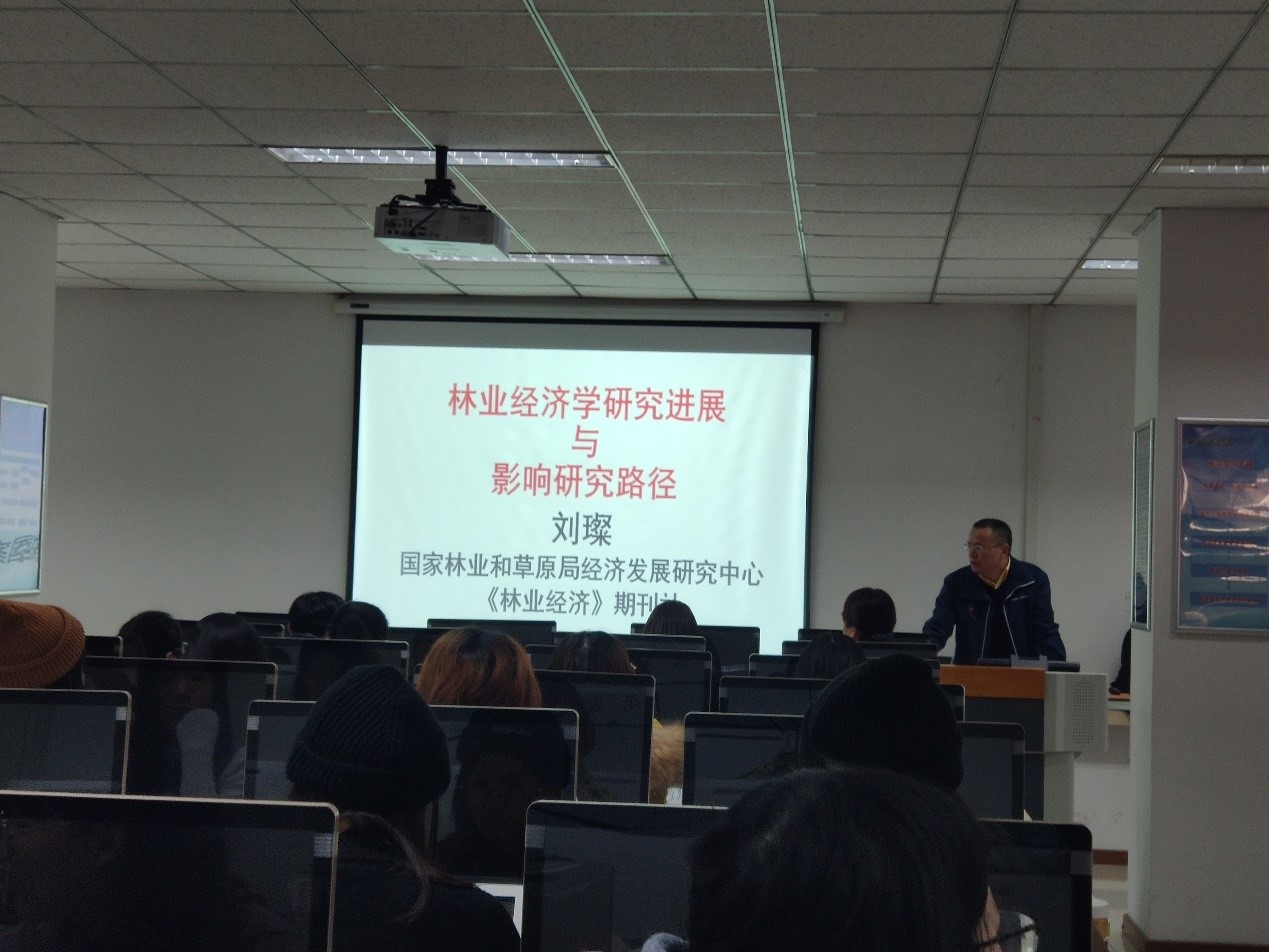 2020年12月16日上午,经管论坛在经管楼210举办。本次论坛由经管学院院长刘芳老师主持,特邀国家林业和草原局经济发展研究中心研究员、《林业经济》期刊社社长刘璨主讲,论坛主题为“林业经济学研究进展与影响研究路径”。经管学院教师及研究生参加了此次论坛。