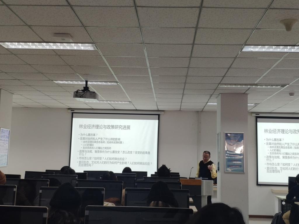 刘教授首先给的大家介绍了经济学的理论,由此引入对林业经济学的介绍,给同学们就林业政策演化以及林业经济理论与政策研究进展作出了详细报告,并对我国的林业改革历史进行了详细介绍。其次,刘教授为大家介绍了如何在研究中选择合适的评价方法,以及如何进行统计分析。并介绍了进行一个科学研究的具体步骤并对研究分析中需要注意的问题为大家进行了细致的讲解。