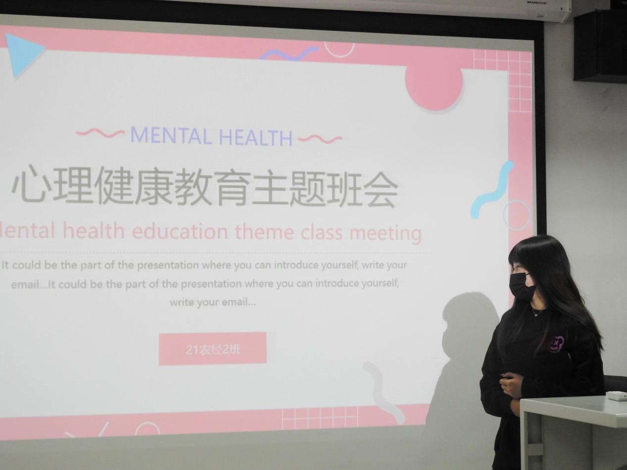 国贸专业的班会设计寓教于乐。制作了“大学生心理健康教育”主题PPT,班委讲解什么是心理健康,如何看待心理问题,如何缓解常见心理问题。将理念植入人心后,班会临时抽取同学做个人心理状态采访,进一步加深印象。最后通过播放大学生心理健康教育的短片,引发同学们的共鸣和思考。