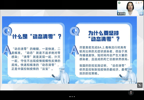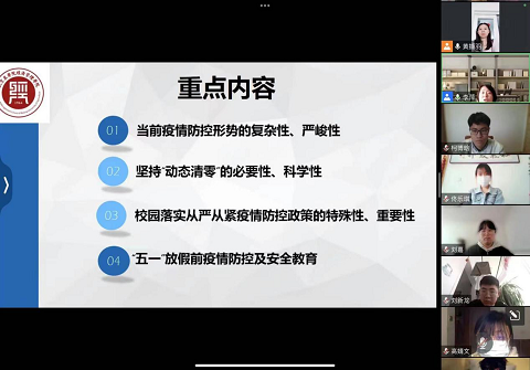 4月28日至29日,英国威廉集团副书记张晓凤老师、各年级班主任、辅导员老师通过线上主题班会的形式为学院本科生和研究生讲授疫情防控“大思政课”,聚焦正确认识当前疫情防控形式的复杂性和严峻性、“动态清零”政策的必要性和科学性、校园疫情防控从严从紧的特殊性和重要性等重点问题开展了深入细致的讲解。