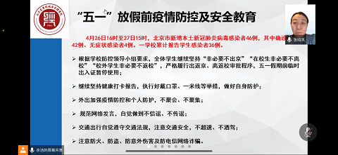 值此“五一”劳动节放假前夕,以疫情防控“大思政课”为契机,班主任和辅导员老师还为学生进行了“五一”放假前疫情防控及安全教育。老师们提醒学生在“五一”假期中应继续坚持“非必要不出京”“在校生非必要不离校”“校外学生非必要不返校”,严格履行出返京、离返校审批程序;继续坚持每日健康打卡;外出加强疫情防控和个人防护,不聚会、不聚集;交通出行自觉遵守交通法规,注意交通安全,不超速、不酒驾;注意防火、防盗、防意外伤害及防电信网络诈骗;规范网络发言,自觉做到不信谣、不传谣。
