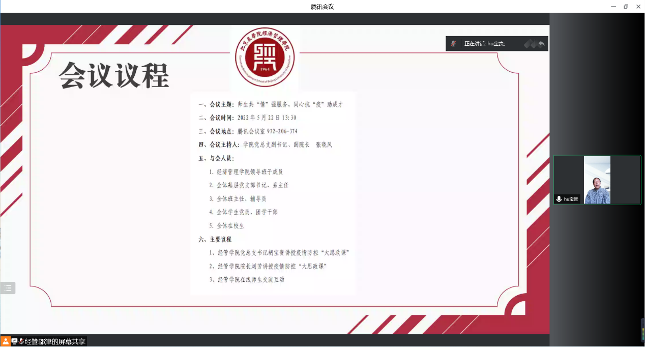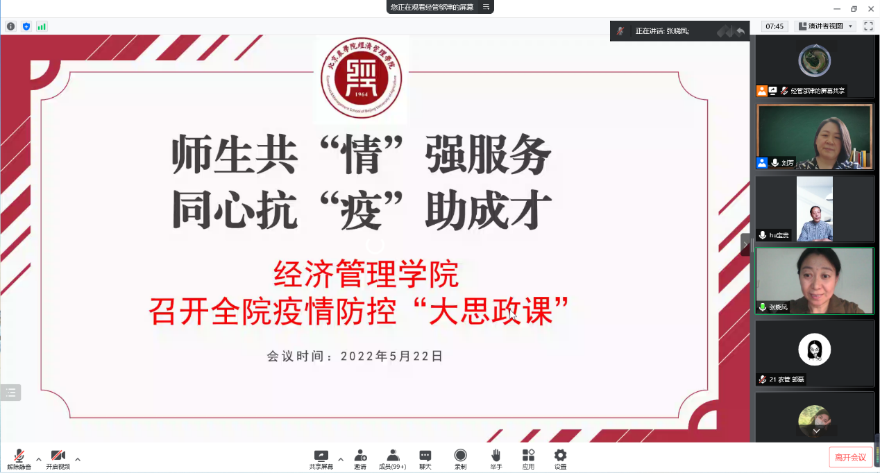 最后,学院领导班子成员与参会师生进行了在线交流,并充分肯定了经管学子在严峻复杂的疫情环境下所表现出强有力的防控思想站位和防控举措执行力,鼓励同学们再接再厉,深入贯彻落实北京市和学校的防疫政策,相信全体师生众志成城,一定能打赢疫情防控阻击战。
