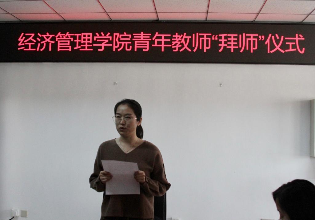 工商管理系主任桂琳代表指导教师在“拜师”仪式上发言。桂老师表示,要在各方面为青年教师树立好榜样,毫无保留地传授教育教学经验,给予青年教师真诚的关心与帮助;认真履行“师徒”协议书的各项职责,严格要求青年教师;为青年教师培养工作竭尽全力,创新探索青年教师培养的内容、方法和途径,助力青年教师成长。希望青年教师尽快实现从学生到高校教师的转变;尽快树立以人为本、教育即是服务的理念;努力练好教育、教学和教科研三个本领;培养起不断创新、团结协作、爱岗敬业、严谨治学的四种精神。