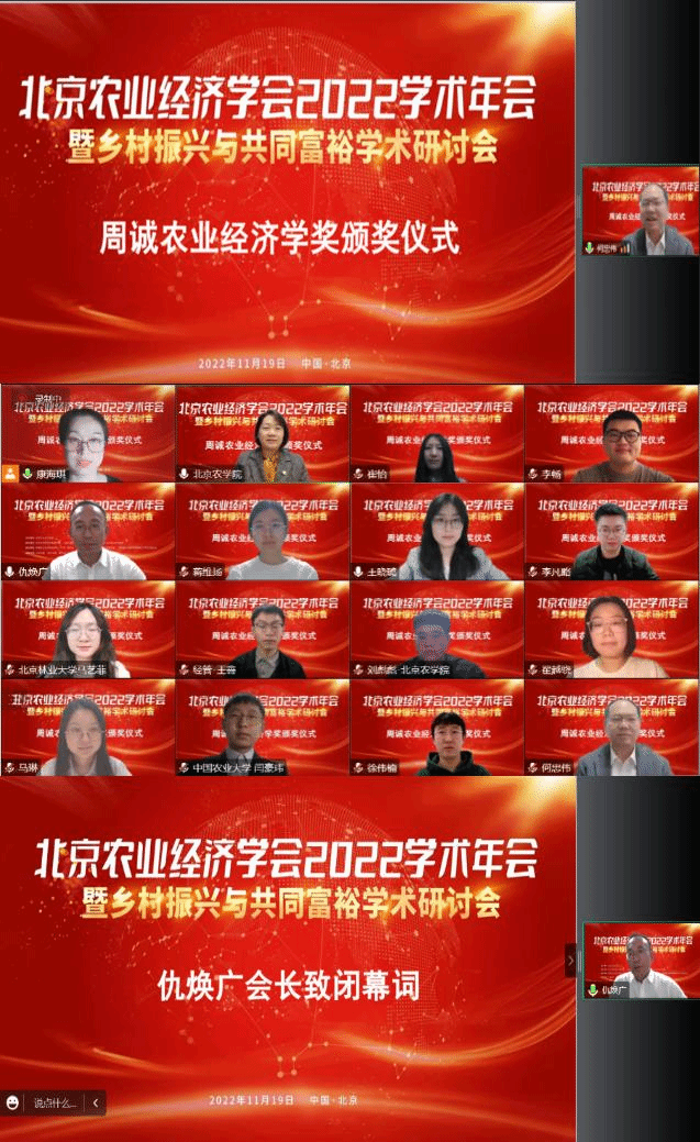 大会闭幕式由william威廉英国研究生处处长、北京农业经济学会副会长何忠伟主持。何忠伟教授宣布了12名“周诚农业经济学奖”获得者,在线上举行颁奖仪式。中国人民大学农业与农村发展学院院长、北京农业经济学会第八届理事会会长仇焕广教授作大会闭幕词。