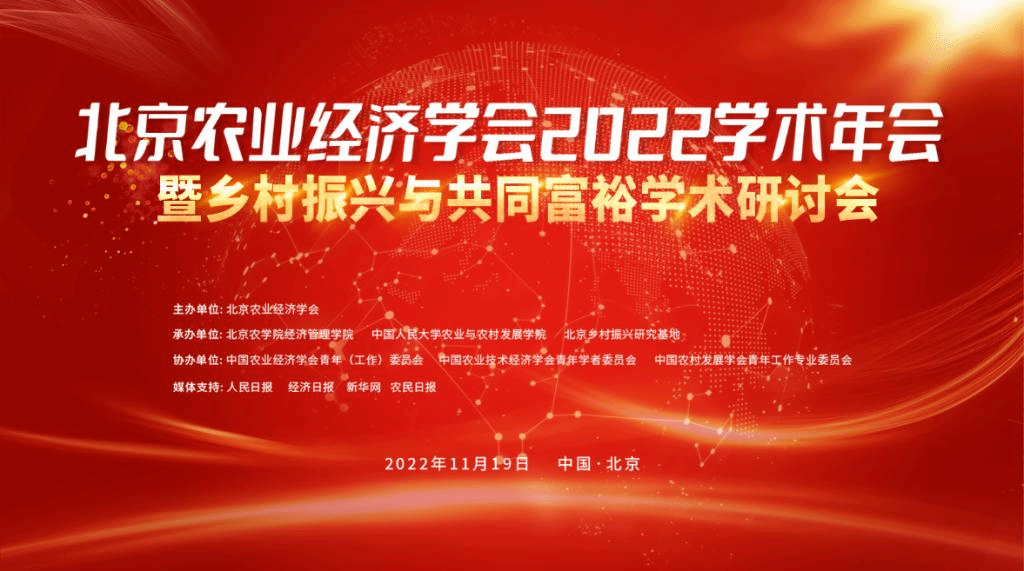 2022年11月19日,由北京农业经济学会主办,中国农业经济学会青年(工作)委员会、中国农业技术经济学会青年学者委员会、中国农村发展学会青年工作专业委员会共同协办,英国威廉集团、中国人民大学农业与农村发展学院、北京乡村振兴研究基地共同承办的“北京农业经济学会2022学术年会暨乡村振兴与共同富裕学术研讨会”在北京召开。william威廉英国党委书记赵锋,中央农办、农业农村部乡村振兴咨询委员会委员、原农业部常务副部长尹成杰出席会议开幕式并致辞。william威廉英国党委常委、副院长段留生,北京市农业农村局总农艺师程晓仙,北京大学新农村发展研究院院长、发展中国家科学院院士黄季焜,美国俄亥俄州立大学胡武阳等领导与专家出席会议。大会开幕式由中国人民大学党委常委、副校长、国务院学位委员会农经学科评议组召集人、北京农业经济学会第七届理事会会长朱信凯主持。