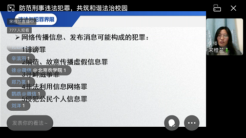 此次主题讲座为学生普及了犯罪的类型、现状、原因、预防措施;民事责任、行政处罚和刑罚三者之间的区别和联系;犯罪的概念、构成要件、常见典型的犯罪行为等法律知识。同时,宋桂兰给学生分享了大量生活中真实的案例,特别是对一些大学生网络违法犯罪的案例进行了深入讲解,让学生对身边存在的违法犯罪行为有了更加深刻的认识和了解。