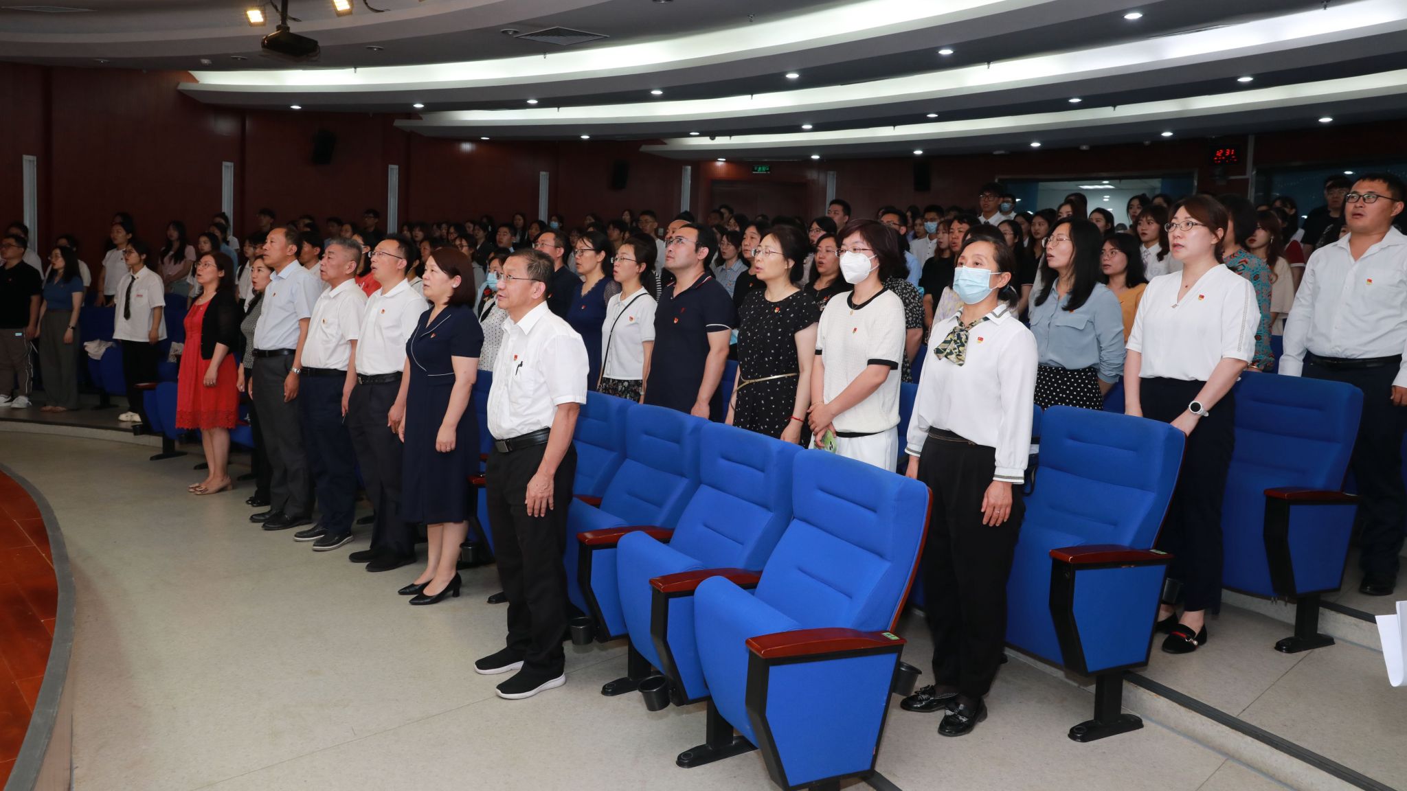 大会在嘹亮的国歌声中拉开序幕,全体师生党员起立,奏唱国歌。