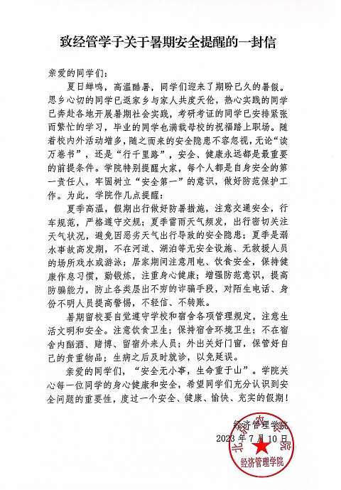 会后,学院向全体经管研究生、本科生发布了致经管学子关于暑期安全提醒的一封信。