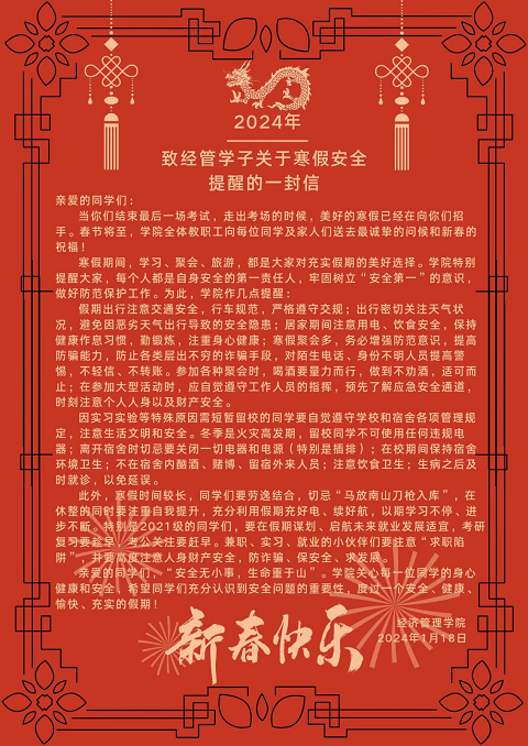 寒假放假前夕,学院通过公众号发布了《致经管学子关于寒假安全提醒的一封信》。下一步学院将推动宿舍育人阵地建设巡回检查座谈工作机制,有效提升宿舍“微环境”的治理成效。