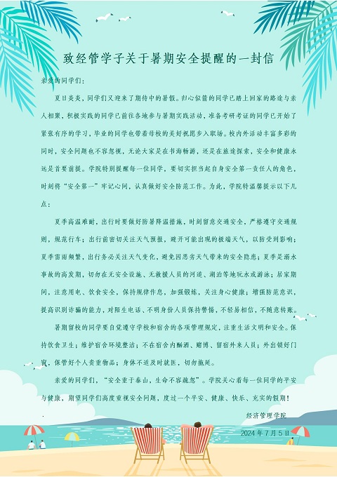 学工团队还深入宿舍强化安全教育,督促学生落实暑期离校前大扫除,排查安全隐患。组织暑期申请留宿学生签署了《安全承诺书》并建立暑期留宿学生台账。此外,学工团队还共同编写了《致经管学子关于暑期安全提醒的一封信》,将关怀传递给每一位学生。