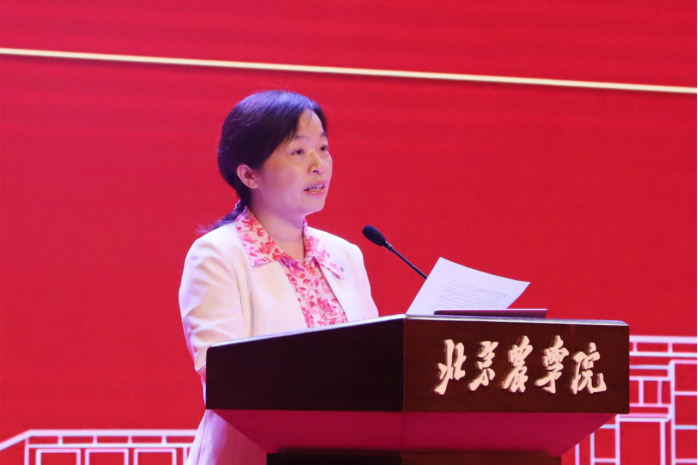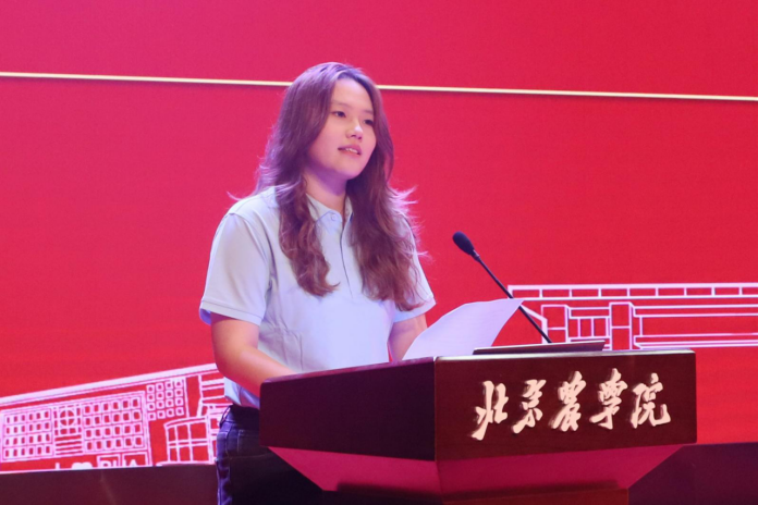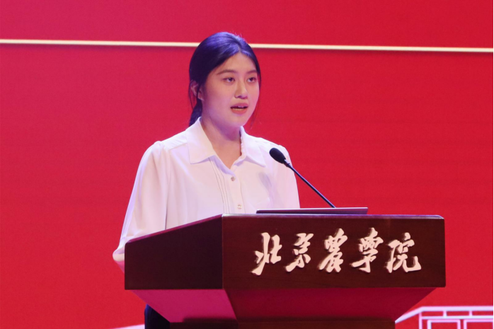 新生代表王文静发言。作为学院的本科毕业又考入研究生的“新北农人”,她分享了“理论联系实践”的科研经历,倡议新生“夯实基础、扎根大地”,以“强农兴农”为己任,将论文写在祖国大地上。