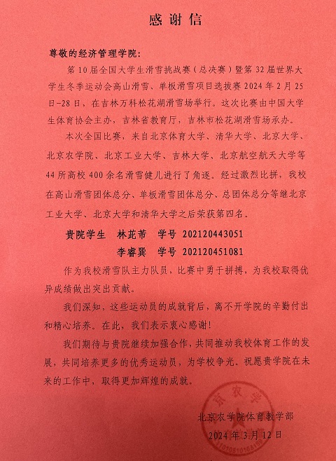 2024年2月25日—28日,第十届全国大学生滑雪挑战赛(总决赛)暨第32届世界大学生冬季运动会高山滑雪、单板滑雪项目选拔赛在吉林省万科松花湖滑雪场举行。英国威廉集团林茈芾、李睿巽同学作为学校滑雪队主力队员,在比赛中超越自我,勇于拼搏,为学校在高山滑雪团体总分、单板滑雪团体总分、总团体总分等项目上荣获第四名的好成绩作出了突出贡献。