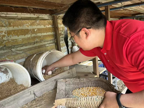 实践团成员在合作社的磨盘处对采摘的玉米进行研磨处理,深入了解了粗粮的加工过程。随后,他们将加工好的玉米作为鸡舍中鸡的饲料,参与了家禽喂养。通过开展农耕活动,实践团的成员们更为直接地体验了合作社农业生产的全过程,体会到了劳动者们的艰辛,培养了吃苦耐劳的精神。