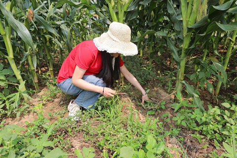 实践团成员来到小片试验田中,对试验田杂草进行人工处理。当前合作社面积较大的耕地已经全部采取机械化方式耕作,大片耕地除草也基本通过现代农机进行,但小片试验田还需要人工进行手动除草。