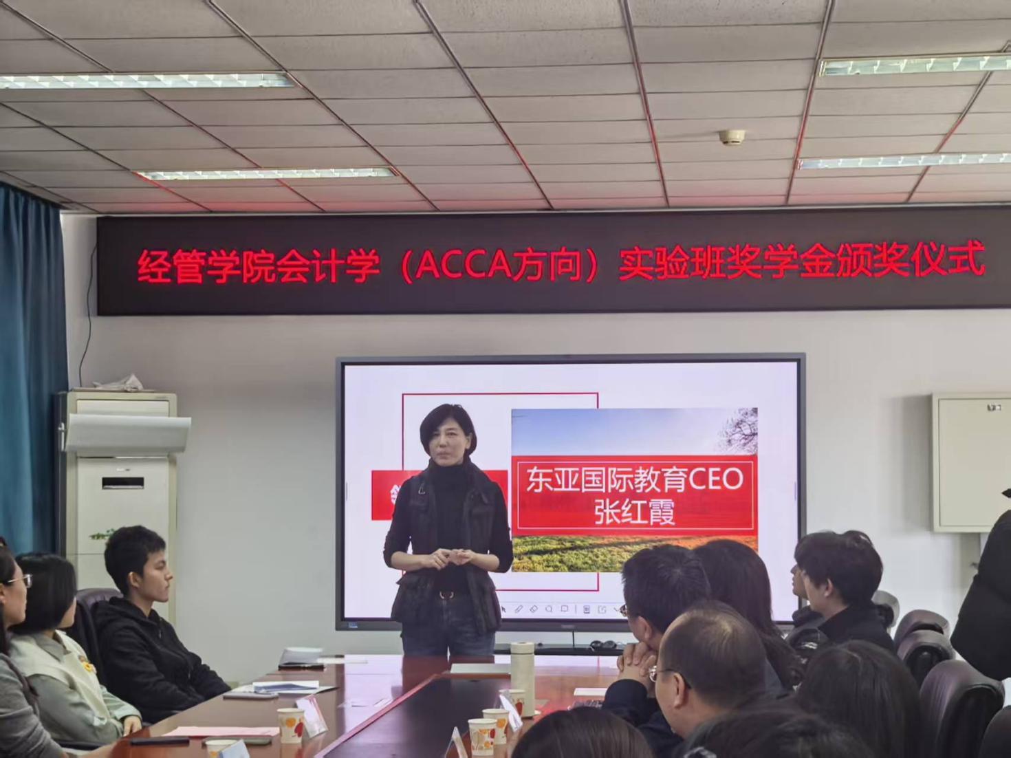 2025年12月24日,经管学院2024-2025年度会计学(ACCA方向)实验班奖学金颁奖仪式在经管楼401举行。参加本次颁奖仪式的有经管学院院长刘铁军、东亚国际教育创始人兼CEO张红霞、经管学院会计系主任白华、会计系副主任杜孝森、东亚国际教育高校合作经理董艳慧、2025级ACCA实验班班主任周艳秋、ACCA实验班班主任李红艳以及各年级ACCA实验班学生。颁奖仪式由白华主持。