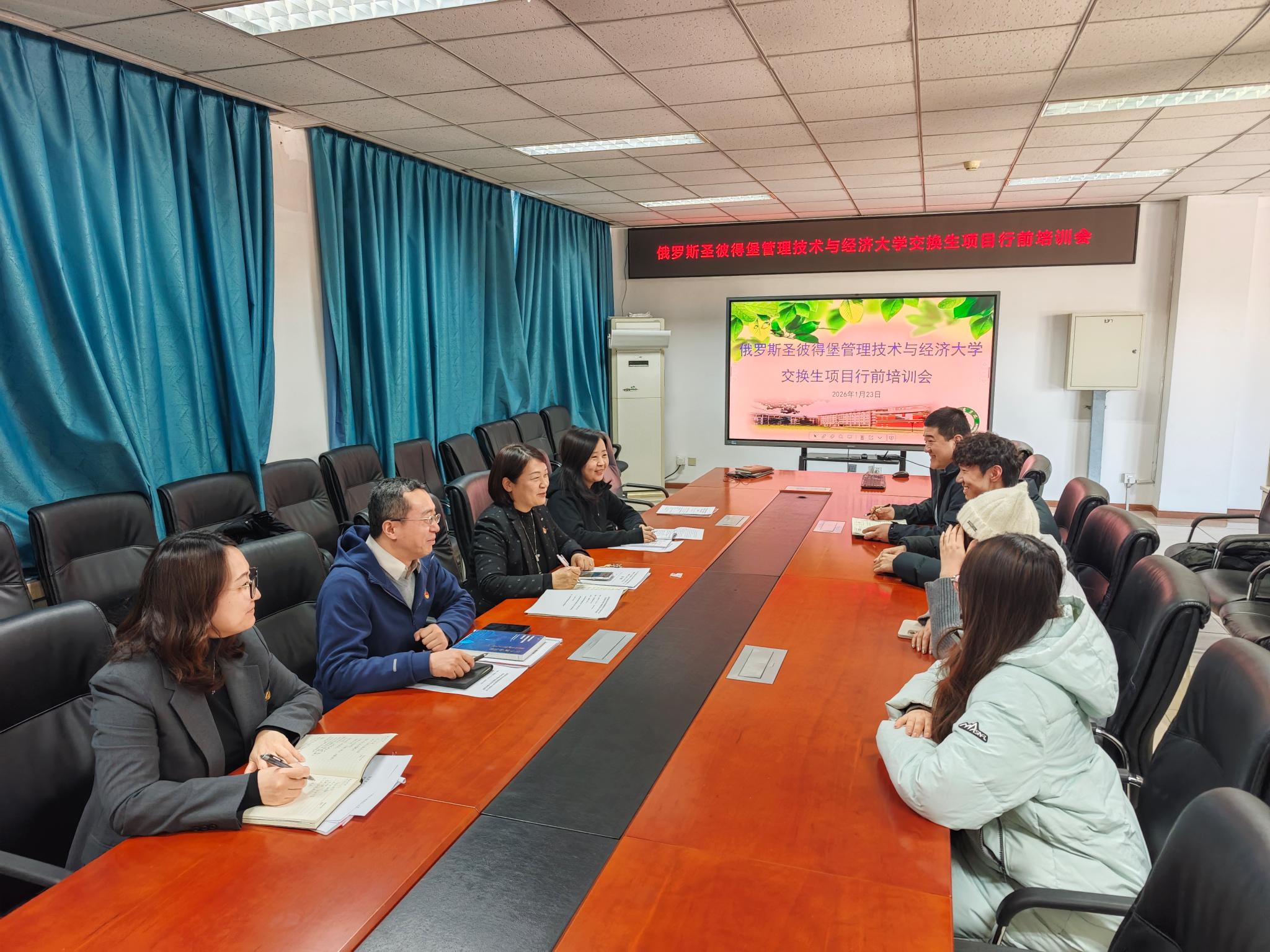 2026年1月23日下午,经管学院在经管楼401会议室召开2026年俄罗斯圣彼得堡管理技术与经济大学交换生出国留学行前培训会。培训会由国际合作与交流处敖日嘎、经管学院党委书记刘芳、副院长徐广才、副书记郝娜主讲,外事秘书余洁、辅导员李敬玉和三名交换生参加本次会议。副院长徐广才主持会议。