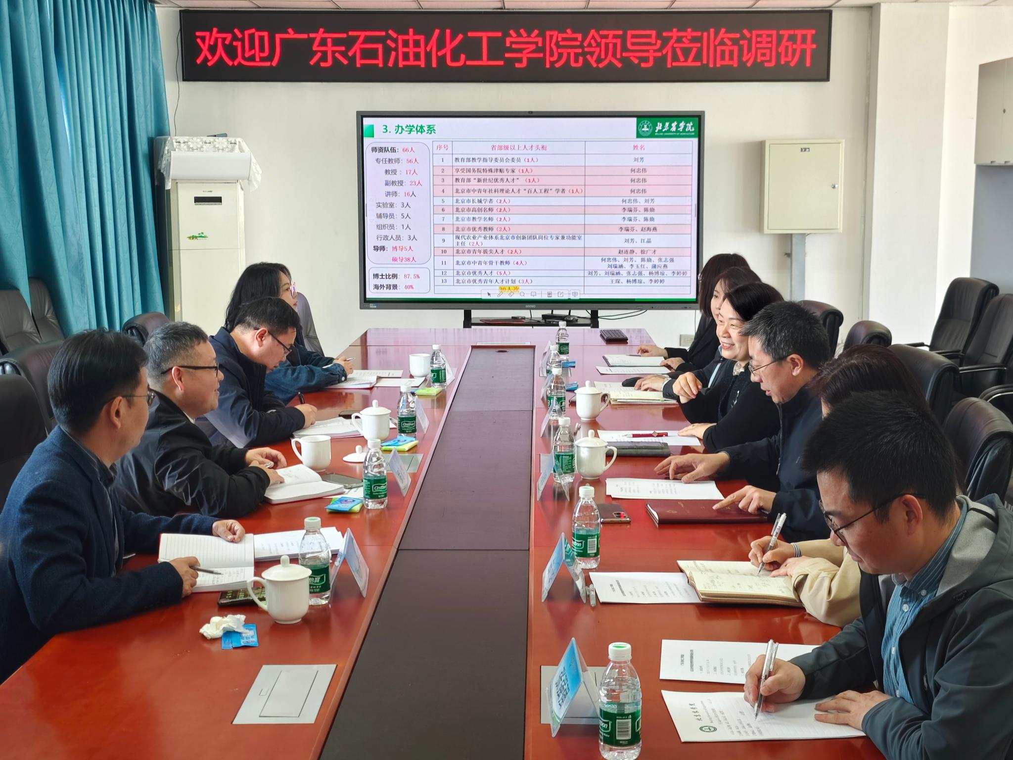 双方围绕数字经济背景下课程体系重构、新增硕士学位授权点的学科基础、师资配置及培养方案进行讨论等议题展开研讨,并专门就合作硕士研究生联合培养机制等进行了深度交流。广东石油化工学院一行参观了农产品融媒体人才培养中心、跨专业综合实训室等教学创新改革实践应用场景。