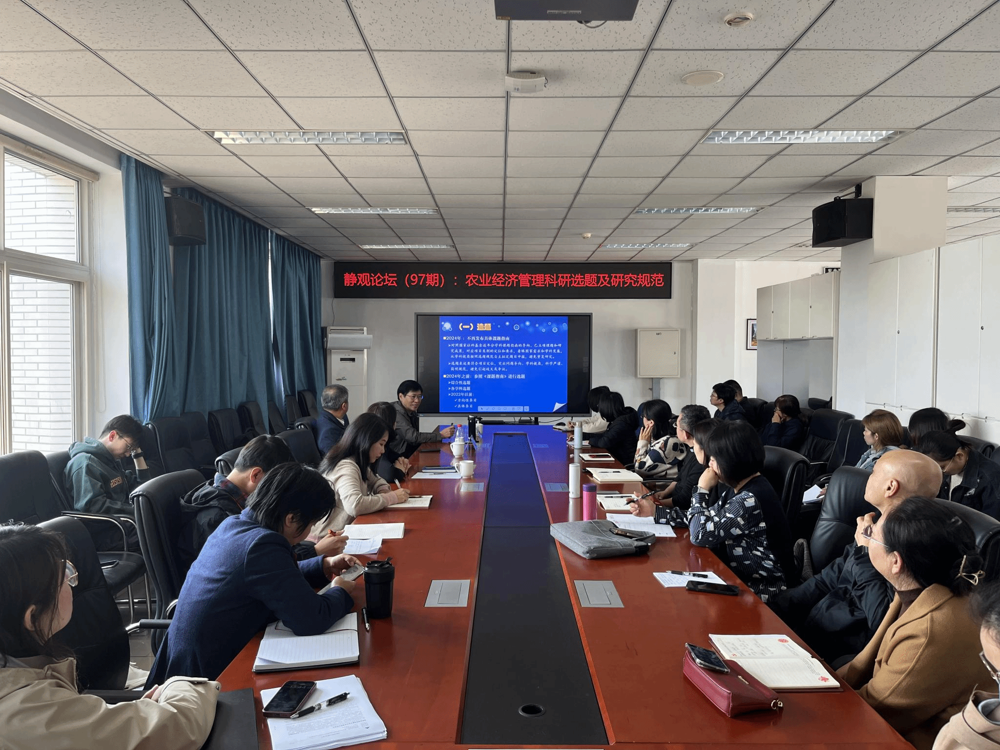 郭翔宇教授首先从农业经济管理科研选题切入,强调研究领域选题应紧密结合国家战略需求和学科发展前沿,突出研究的创新性和实用性。他系统介绍了农业经济管理研究的规范性要求,内容涉及文献综述、研究设计、成果展示等具体环节,为提高学院学术研究的严谨性和科学性提出了大量有益建议和指导。