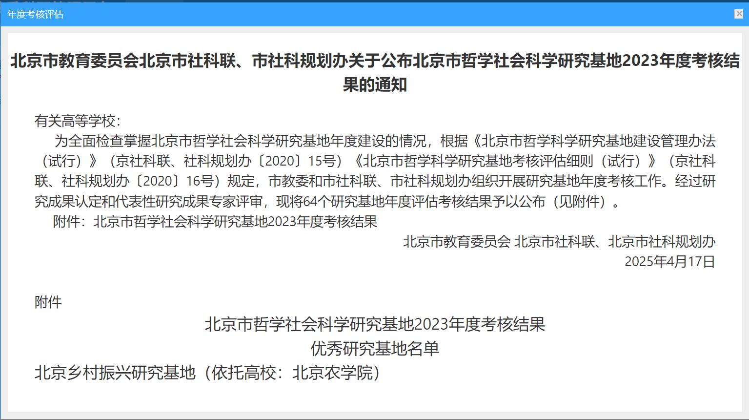 近日,北京市哲学社会科学研究基地公布了2023年度考核结果,经过研究成果认定和代表性研究成果专家评审,我校北京乡村振兴研究基地在64个研究基地年度评估考核中脱颖而出,再次荣获“优秀研究基地”。