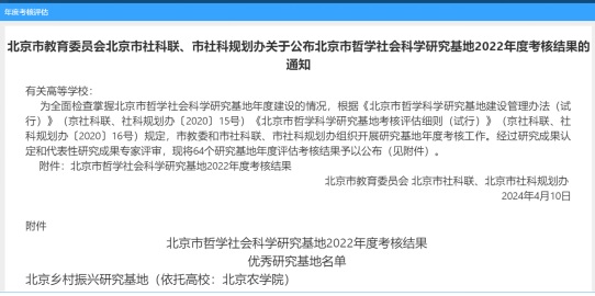 近日,北京市教委、市社科联和规划办公布了北京市哲学社会科学研究基地2022年度考核结果。经过研究成果认定和代表性研究成果专家评审,北京乡村振兴研究基地在年度评估考核中荣获“优秀”。