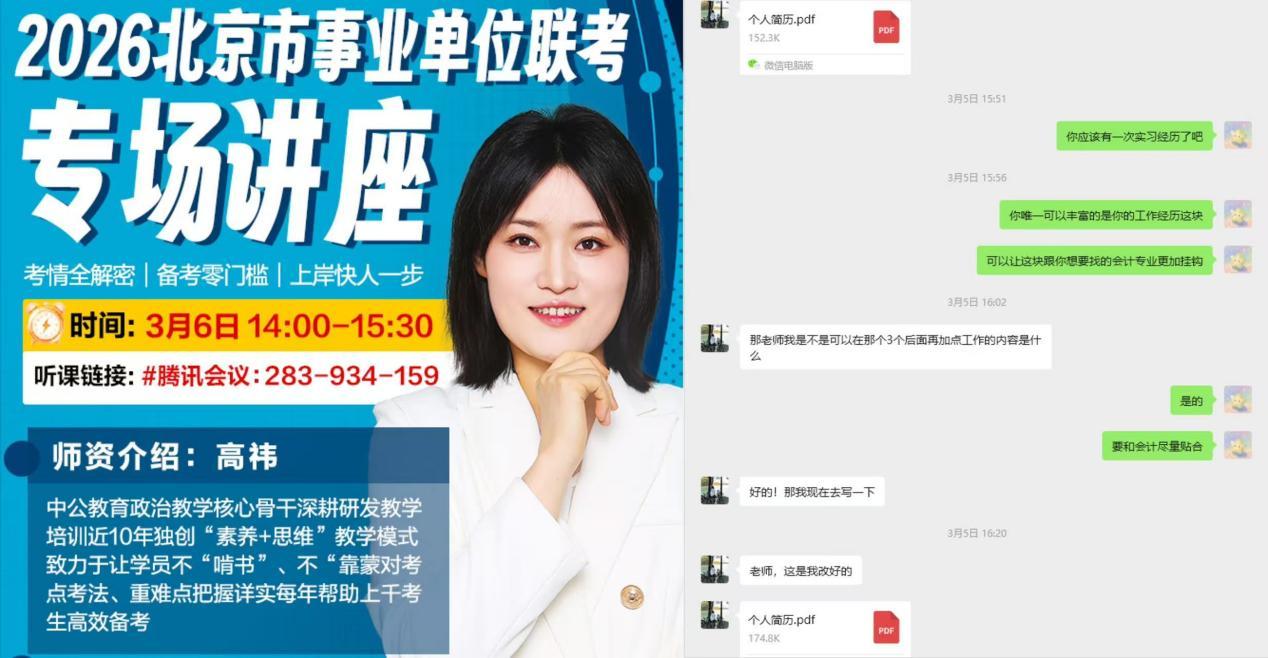 抓就业指导,增服务温度学院全面摸排就业情况,精准把握毕业生需求,邀请行业专家开展线上事业单位备考指导,常态化开展“职业生涯与就业咨询”服务。寒假期间累计为300余名毕业生提供简历修改、就业咨询等服务。此外,学院还建立了跟踪反馈机制,根据学生意见持续优化服务,让就业指导更有温度、更具实效。会计专业的毕业生李佳润说:“老师帮我修改简历后,我收到了好几个面试邀请,之前投了好多都没回音,真的太感谢学院的就业指导服务了!”