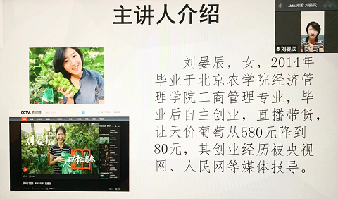 此次交流会采取线上访谈的形式,学院特别邀请到了工商管理专业2014届校友刘晏辰为同学们进行经验分享。刘晏辰自毕业后,返回家乡,依托特色葡萄产业资源进行自主创业,其经历被央视网、人民网等媒体报导。