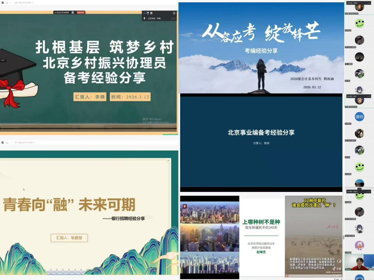 会议特邀5名优秀毕业生开展经验分享,聚焦事业单位招考、银行招聘、西部计划等毕业生高度关注领域深入交流。学长学姐们详细拆解各岗位特点,倾囊相授备考策略与应试要点,并结合自身任职经历介绍工作日常与发展路径。农林经济管理专业的毕业生白鹏说:“这次分享会太及时、太实用了!学长学姐们分享的一手经验,让我直观了解了真实的工作状态与成长轨迹,对我未来的职业规划极具启发。”