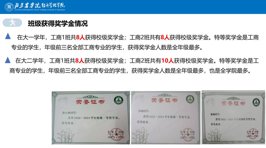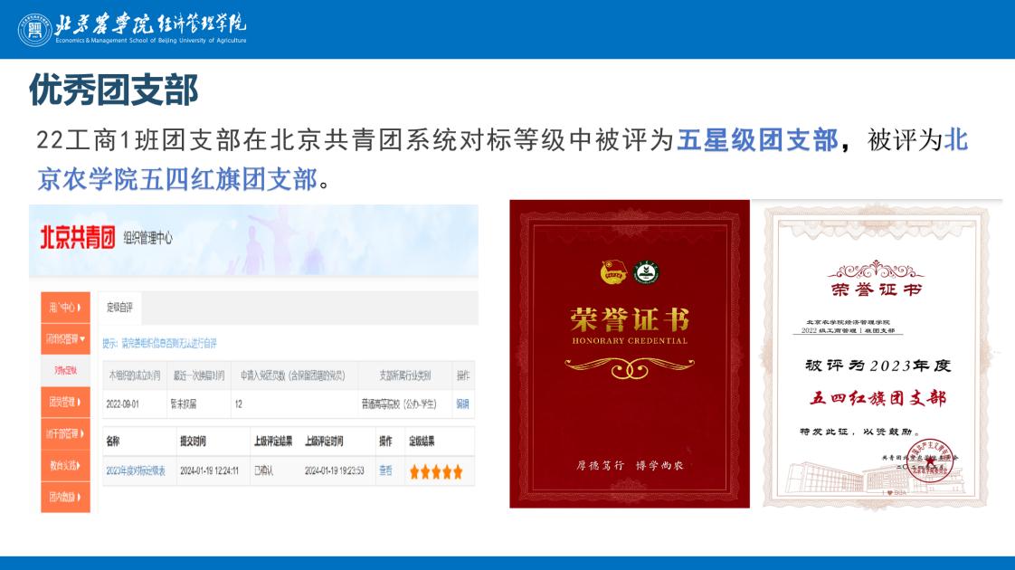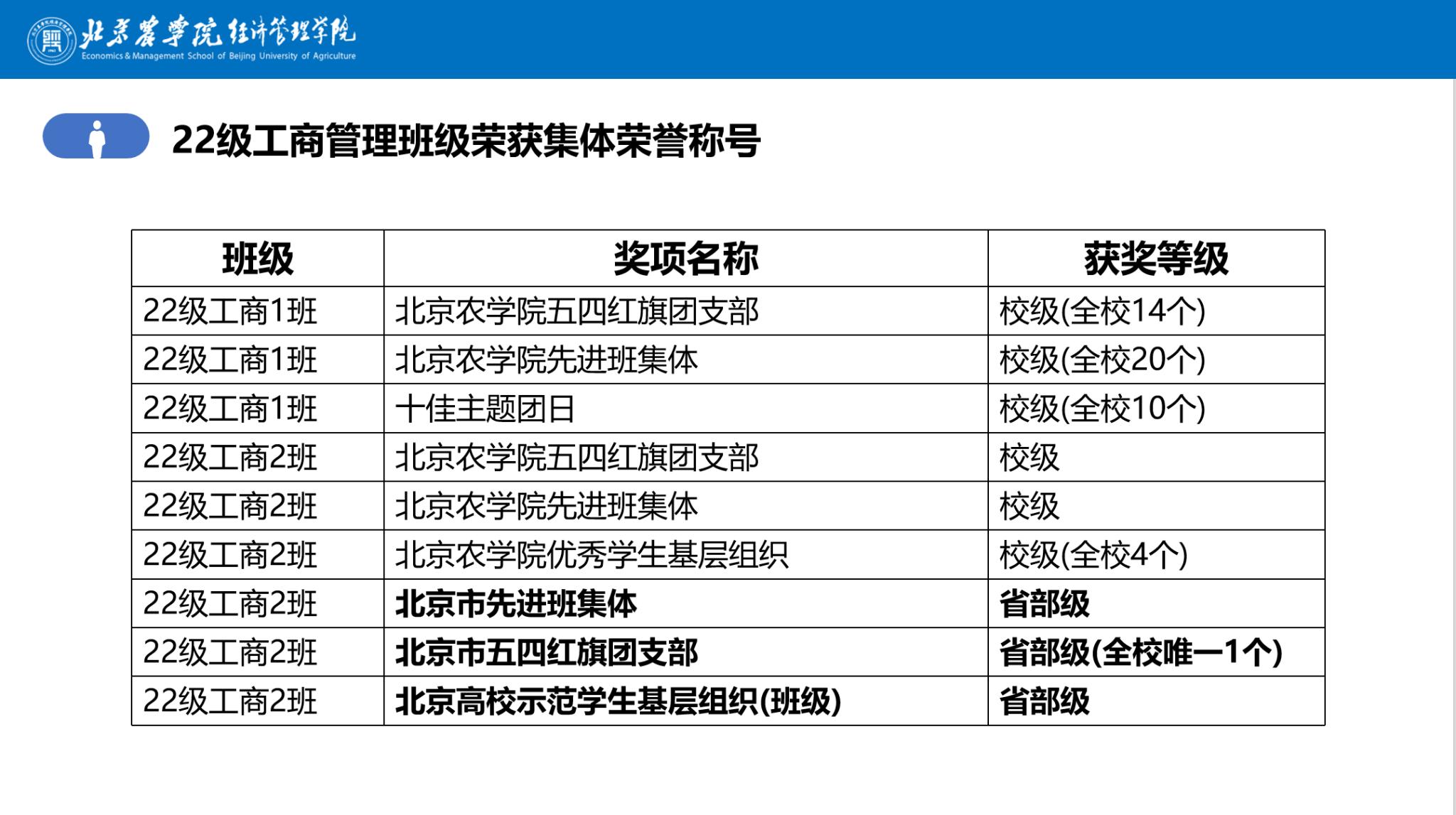 在全体同学的共同努力下,班级建设荣誉满载。截至目前,2022级工商管理专业共荣获包括“北京市先进班集体”、“北京市五四红旗团支部”和“北京高校示范学生基层组织”在内的3项市级荣誉,以及6项校级班集体荣誉。这些沉甸甸的荣誉,属于每一位为之奋斗的同学。